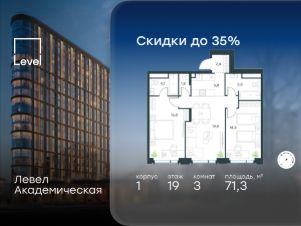 В Академическом районе продаётся 3-комнатная квартира площадью 71.30 кв.м без отделки. Квартира расположена на 19-м этаже 19-этажного жилого комплекса бизнес-класса Левел Академическая (компания Level Group).