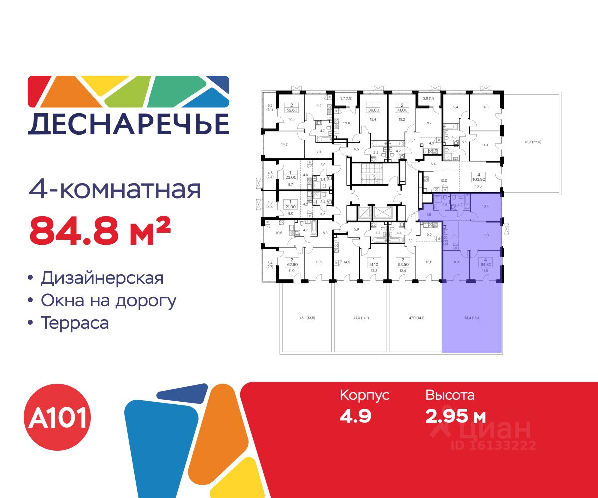 Продается четырехкомнатная квартира 2014 в новостройке ЖК "Деснаречье" по адресу Москва, ТиНАО, Новомосковский АО, Десеновское С/П, Десна деревня, Москва, район Троицк, ЖК Деснаречье, к. 4.9. Общая площадь квартиры - 84.50 кв. м., этаж 2 из 15, секция 27. Тип проекта, по которому построен дом - монолит, компания-застройщик - ООО "А101". Стоимость квартиры - 22313968 Р.