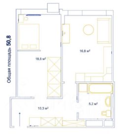 - Кухня: 16.8 кв. м — простор для кулинарных экспериментов и семейных ужинов. Комната-18.5 кв. м