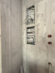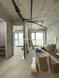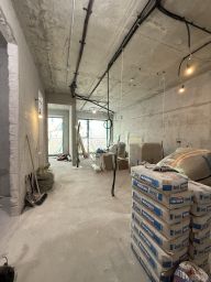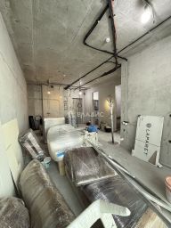 Выполнены все конструктивные работы: возведены стены, стяжка, сделаны внутренние работы по санузлу. По требованию УК проекты и подготовлена: электрика, вода, кондиционирование.