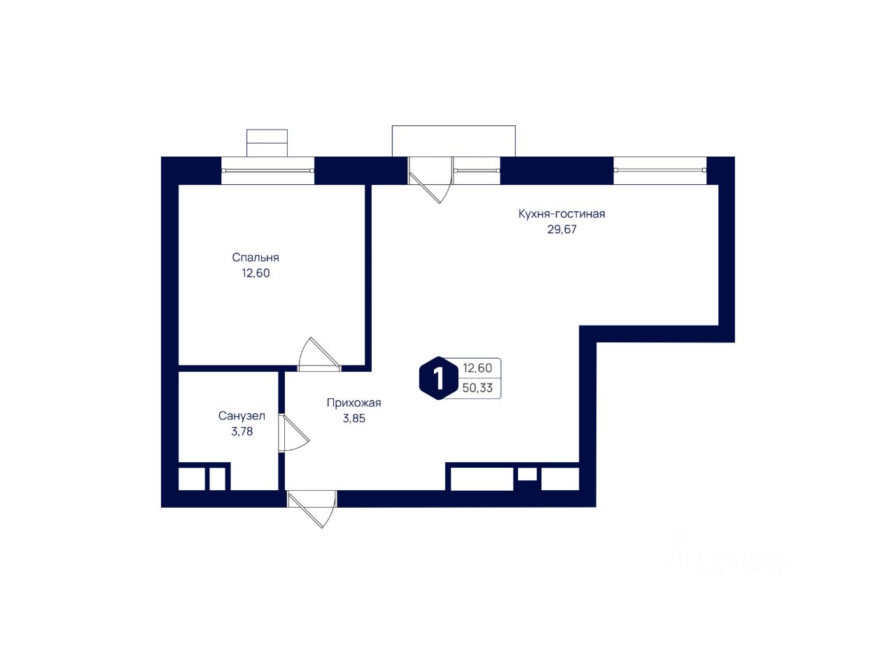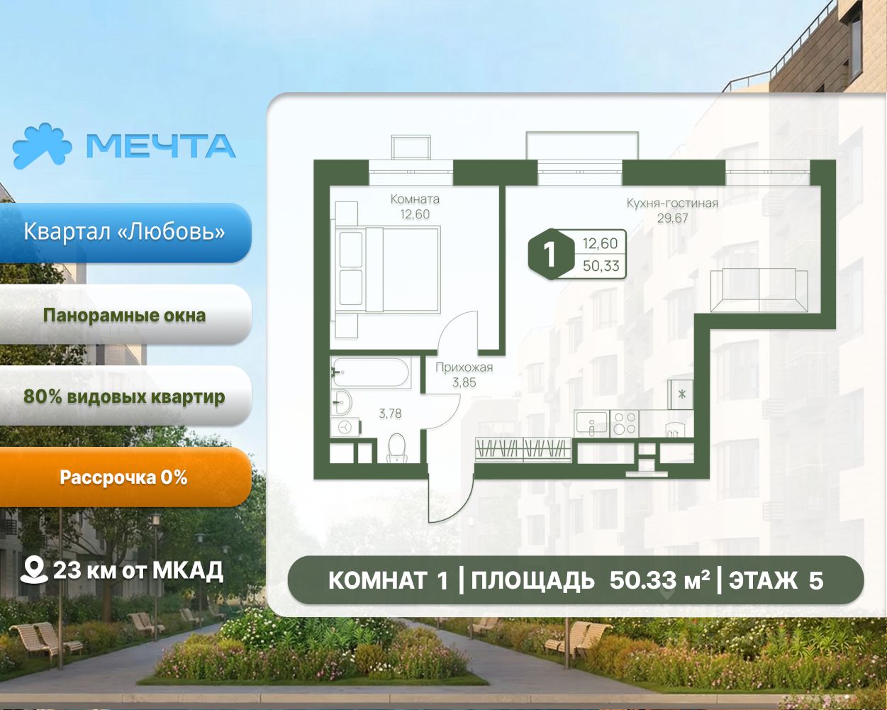 Продается однокомнатная квартира в квартале "Любовь" жилого комплекса "Мечта". Общая площадь квартиры: 50.33 кв. м, этаж 5 из 5.