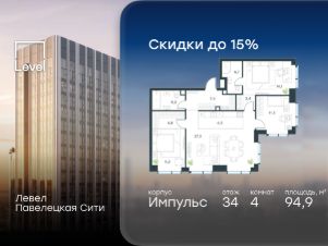 В Даниловском районе столицы (ЮАО) продаётся 4-комнатная квартира площадью 94.90 кв.м без отделки. Квартира расположена на 34 этаже 45-этажного корпуса 15 в жилом комплексе бизнес-класса Левел Павелецкая Сити. Высота потолков 3.00м.
