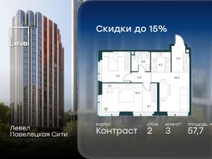 В Даниловском районе столицы (ЮАО) продаётся 3-комнатная квартира площадью 57.70 кв.м без отделки. Квартира расположена на 2 этаже 27-этажного корпуса 14 в жилом комплексе бизнес-класса Левел Павелецкая Сити. Высота потолков 3.00м.