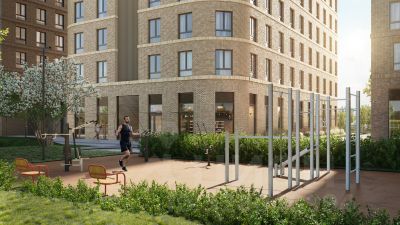 Рядом с жилым комплексом будет создан ландшафтный парк площадью 2,4 га. В парке будут высажены высокие деревья, луговые травы и кустарники, благоустроены лаунж-зоны у пруда, дорожки для бега и прогулок. В центре парка предусмотрена событийная площадь, рядом расположатся дополнительные спортивные и детские площадки, а также зона для выгула домашних питомцев.