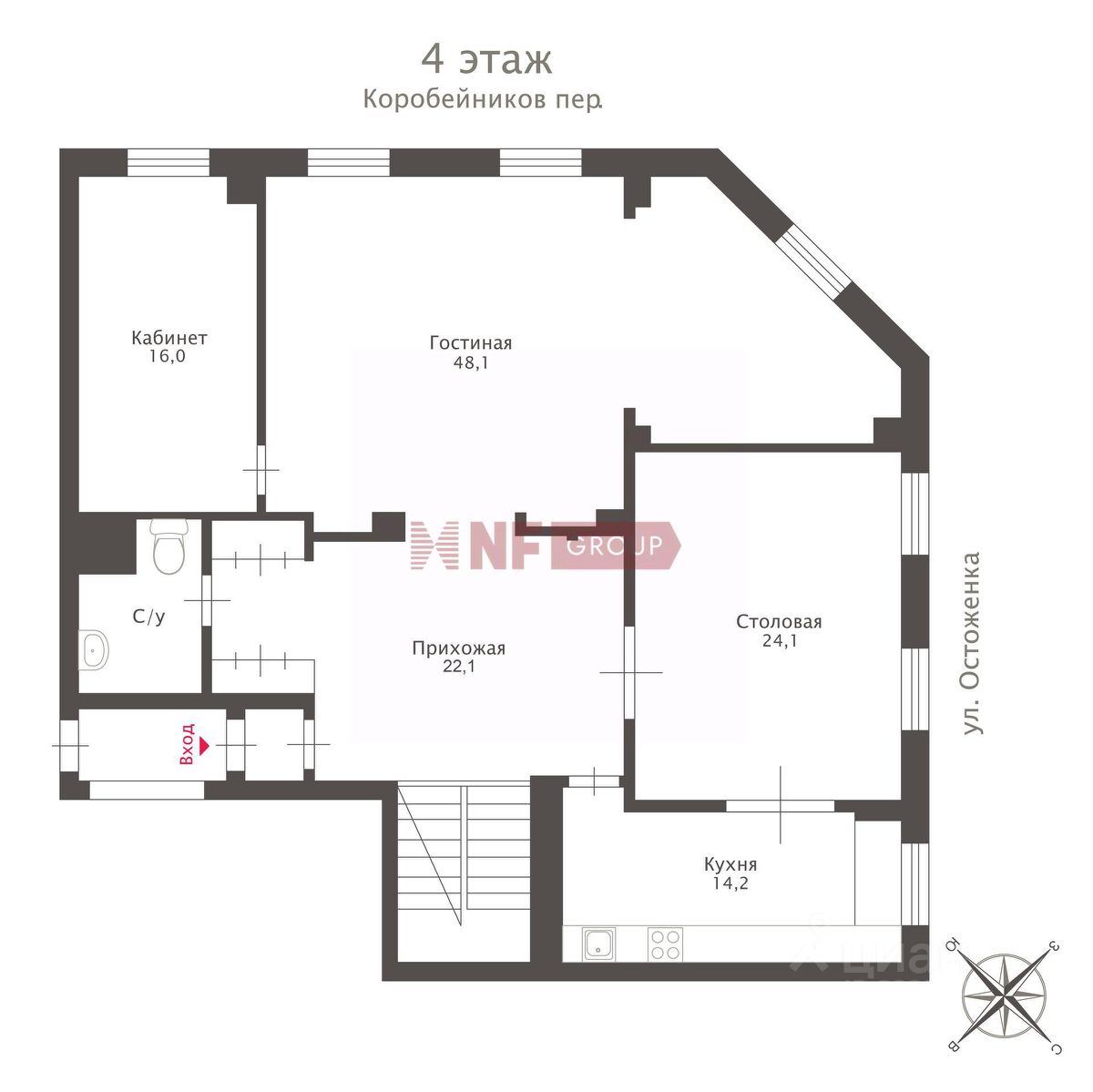 Окна выходят на 2 стороны света: открывается красивый на улицу Остоженка и в Коробейников переулок.