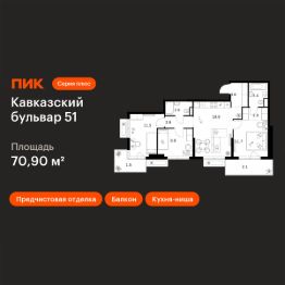 Продаётся 3-комн. квартира площадью 70,9 кв.м на 5 этаже 24 этажного дома (Корпус 3.5, Секция 2) проекта ПИК Кавказский бульвар 51. Светлый просторный подъезд на уровне земли, функциональная планировка, большие окна, предчистовая отделка.