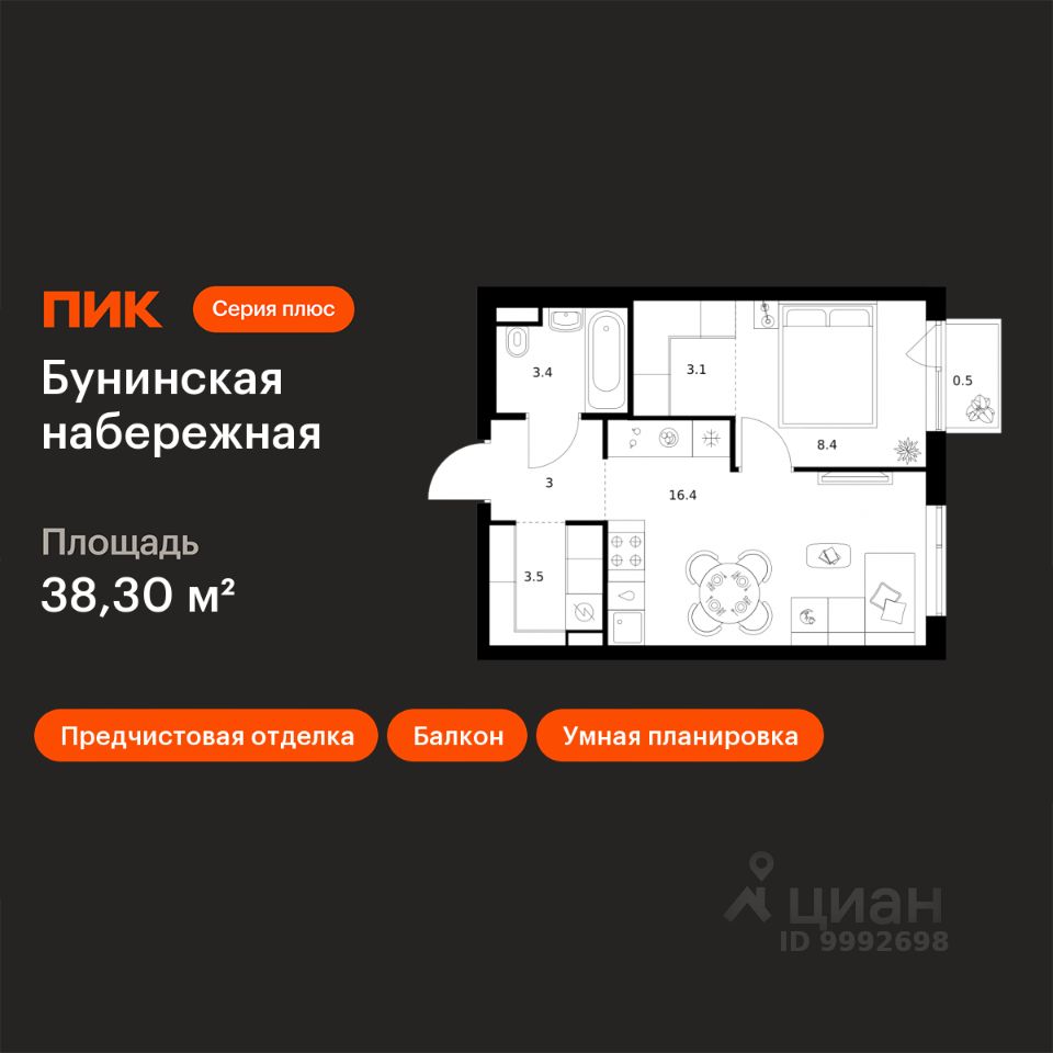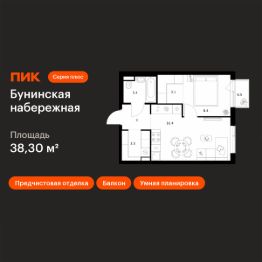 Продаётся 1-комн. квартира площадью 38,3 кв.м на 10 этаже 16 этажного дома (Корпус 2.6/1.2, Секция 2) проекта ПИК Бунинская набережная. Светлый просторный подъезд на уровне земли, функциональная планировка, большие окна, предчистовая отделка.