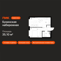 Продаётся 1-комн. квартира площадью 35,1 кв.м на 11 этаже 16 этажного дома (Корпус 2.6/1.3, Секция 3) проекта ПИК Бунинская набережная. Светлый просторный подъезд на уровне земли, функциональная планировка, большие окна, c отделкой.