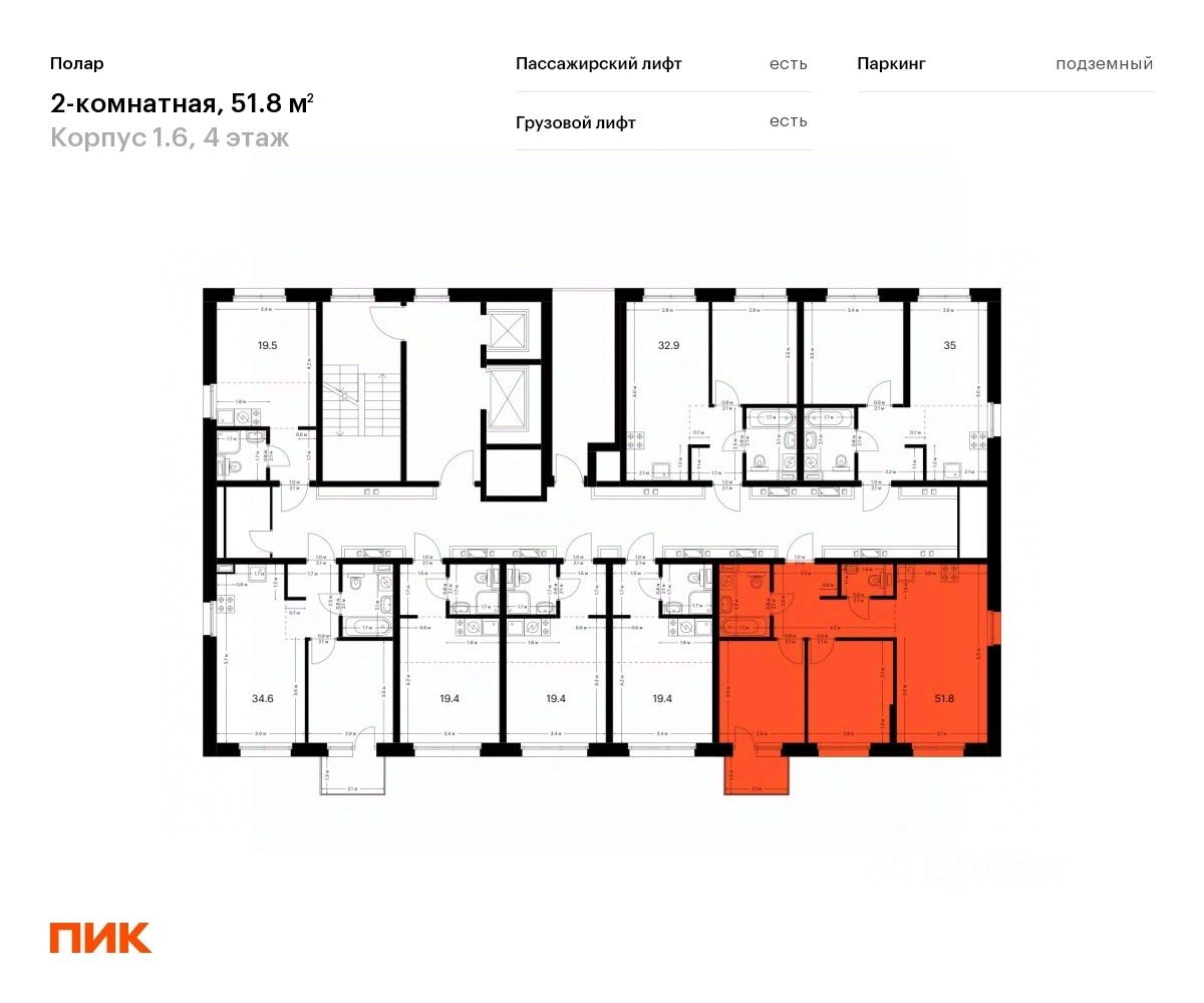 Продаётся 2-комн. квартира площадью 51,8 кв.м на 4 этаже 14 этажного дома (Корпус 1.6, Секция 3) проекта ПИК Полар. Светлый просторный подъезд на уровне земли, функциональная планировка, большие окна, c отделкой.