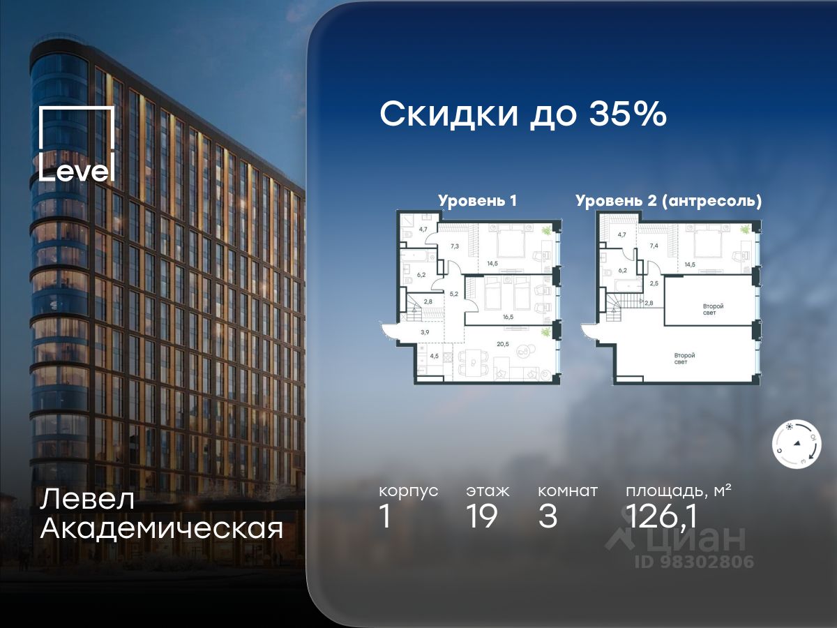 В Академическом районе продаётся 3-комнатная квартира площадью 126.10 кв.м без отделки. Квартира расположена на 19-м этаже 19-этажного жилого комплекса бизнес-класса Левел Академическая (компания Level Group).