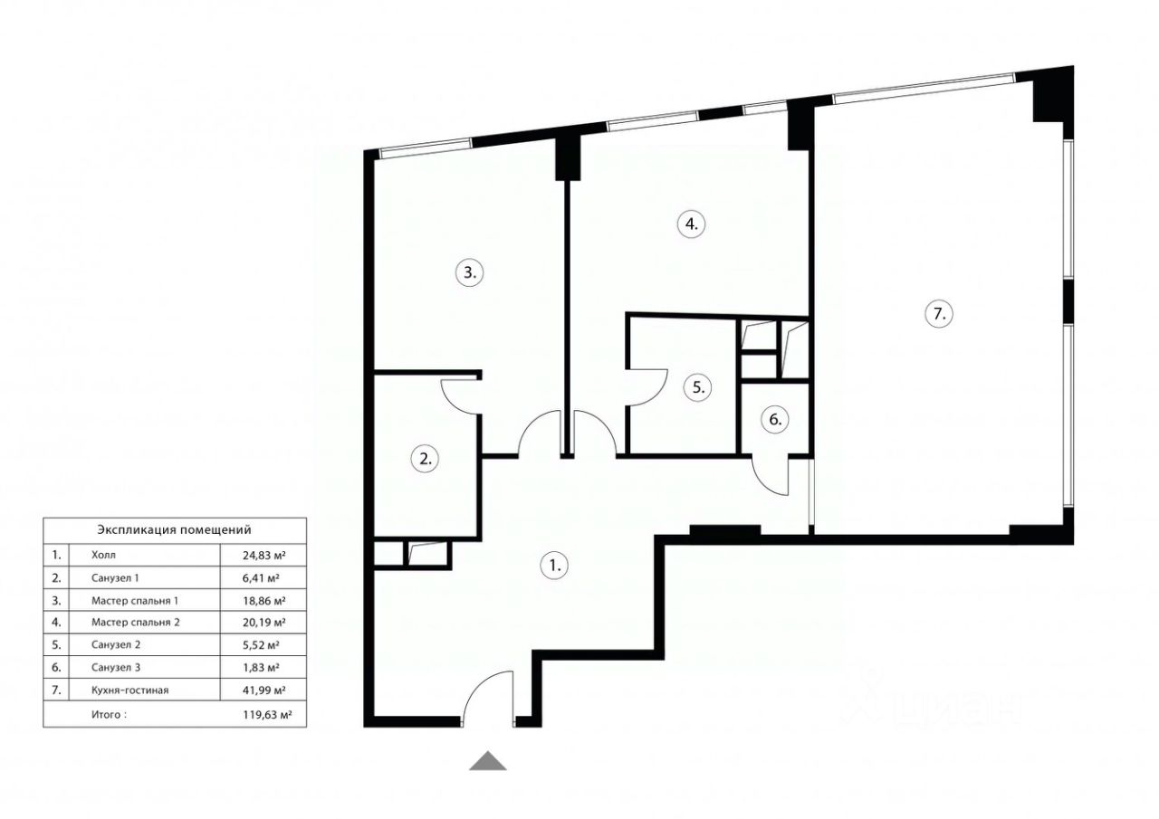 Пространство квартиры позволяет организовать просторную кухню-гостиную с панорамным остеклением, две мастер-спальни со своими санузлами и гардеробными, большой холл и гостевой санузел.