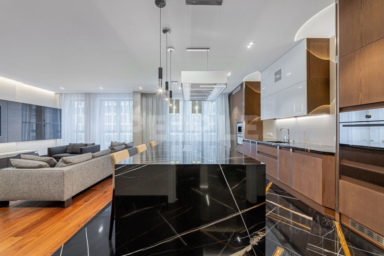 - Кухня, совмещенная с гостиной, полностью оборудованная для самой взыскательной хозяйки, с бытовой техникой ведущих производителей. Кухонный гарнитур компании Brummel.