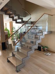 Первый уровень: Удобное зонирование рабочего и жилого пространства: кабинет (45 м2, с отделкой из натурального шпона ценных пород дерева с двумя окнами и балконом) находится при входе в квартиру, далее располагается просторная студия (106 м2, гостиная + обеденная зона + кухня со встроенной техникой), встроенные шкафы, гостевой санузел. Дизайн лестницы гармонично вписывается в интерьер, не утяжеляет его, благодаря стеклянным вставкам.