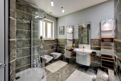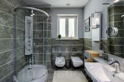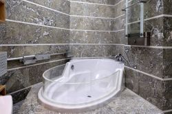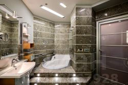 • Большой санузел с душевой кабиной и ванной на подиуме, всё в натуральном камне.