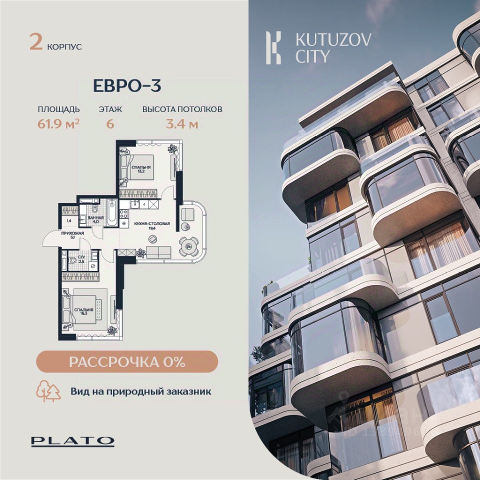 Продаётся просторная двухкомнатная квартира площадью 61,9 м² в башне "Равновесие" клубного дома "Кутузов Сити".