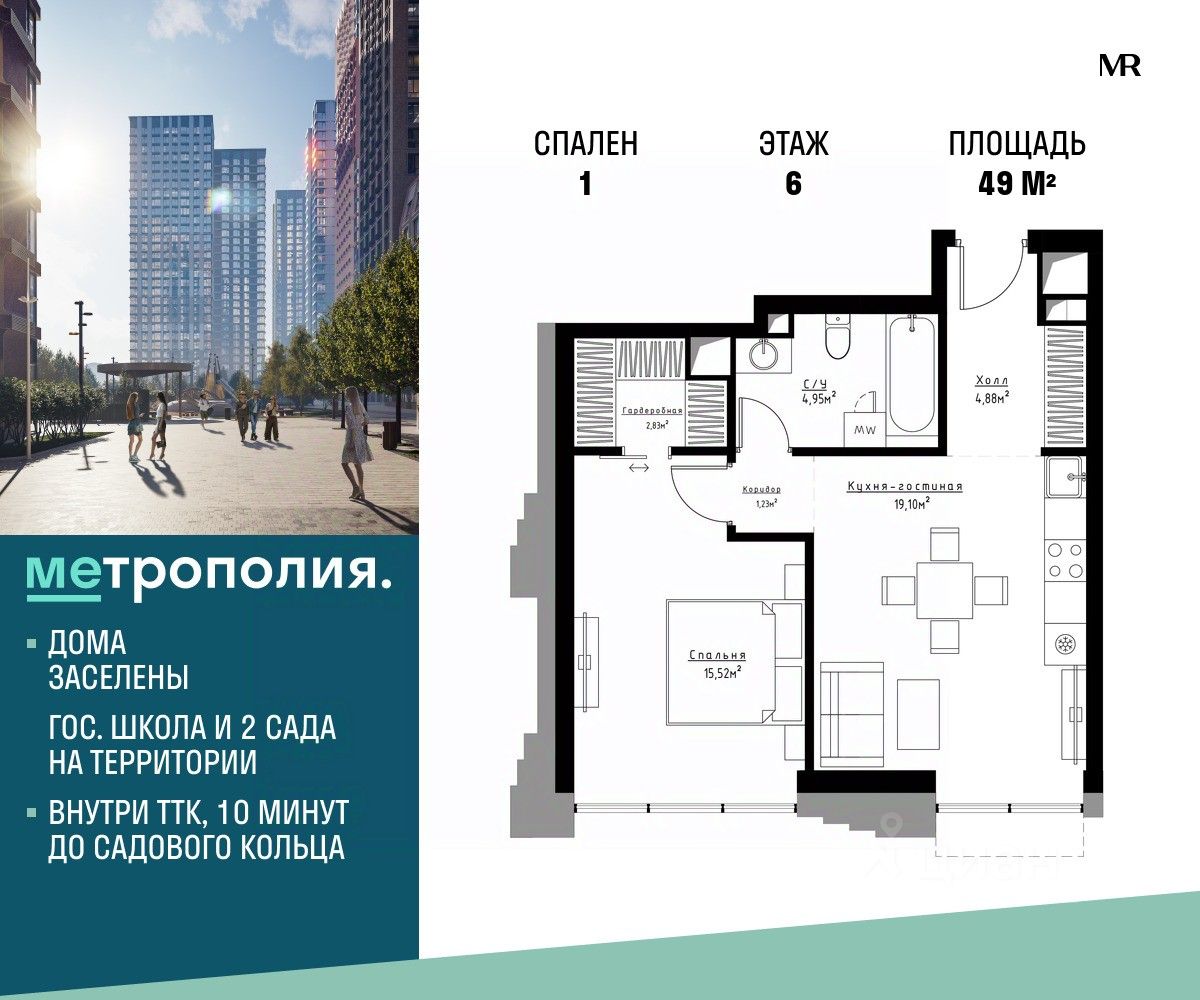 Продаётся 1-комнатная квартира общей площадью 49 м², на 6 этаже.