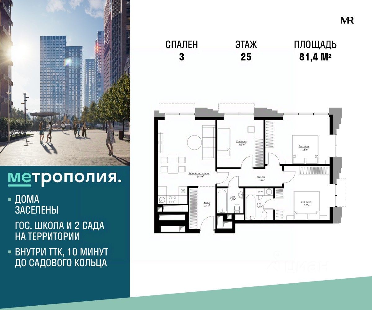 Продаётся 3-комнатная квартира общей площадью 81.40 м², на 25 этаже.