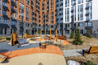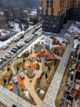 Огороженный двор без машин, во дворе установлены игровые и спортивные площадки.
