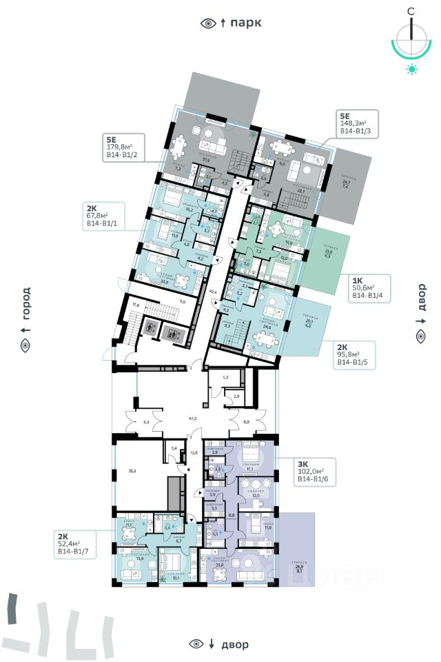 В продаже — четырехкомнатная квартира, общей площадью 178,5 кв. м. Квартира расположена на первом этаже десятиэтажного корпуса Балансд в квартале В14 нового района СберСити, который строит Сбер.