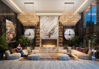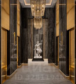Просторное гранд-лобби с высотой потолка 7м. Дизайн Гранд Лобби выполнен в стиле классических люксовых отелей с использованием премиальных материалов.