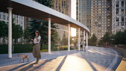 Высотные здания "Метрополии" образуют благоустроенное дворовое пространство на 4,6 га, которое украсят более 400 деревьев и несколько сотен кустарников, живописные цветочные клумбы и аккуратные газоны.