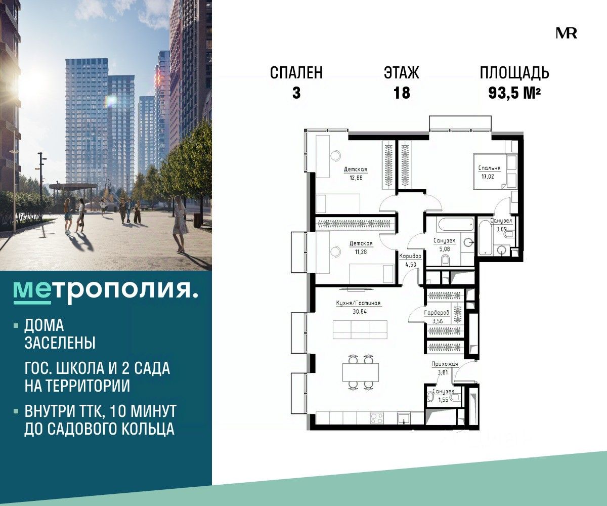 Продаётся 3-комнатная квартира общей площадью 93.50 м², на 18 этаже.
