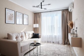 В квартире есть всё, что нужно для проживания или сдачи в аренду: кухня 7 кв.м с современной бытовой техникой и мебелью (красивый гарнитур под единой столешницей, холодильник, духовой шкаф с газовой варочной поверхностью, посудомоечная машина, стол со стульями), комната 17,6 кв.м с кондиционером и мебелью (раскладной диван, журнальный столик и ковер, современные тумбы, светильник, встроенный шкаф с системой хранения до потолка), санузел с душевой кабиной и стиральной машиной, прихожая с зеркалом и шкафом, металлическая входная дверь. Вся квартира наполнена светом и теплом. Из окон открывается красивый вид на сквер.