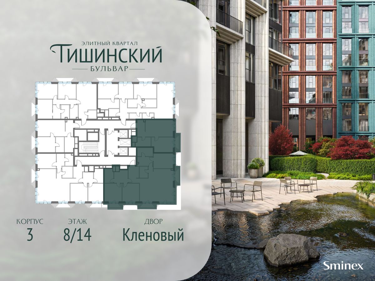 "Тишинский бульвар" - тихий зелёный элитный квартал на Тишинке, в престижном и комфортном районе центра Москвы. В нём создан уникальный для элитного дома прогулочный бульвар в своём огромном парке 1,9 га. В парке оборудованы зоны для активного и тихого отдыха, крытые галереи, приватные зелёные комнаты, многофункциональная спортивная площадка, воркаут-зона, детская площадка, сухой фонтан, ручей.