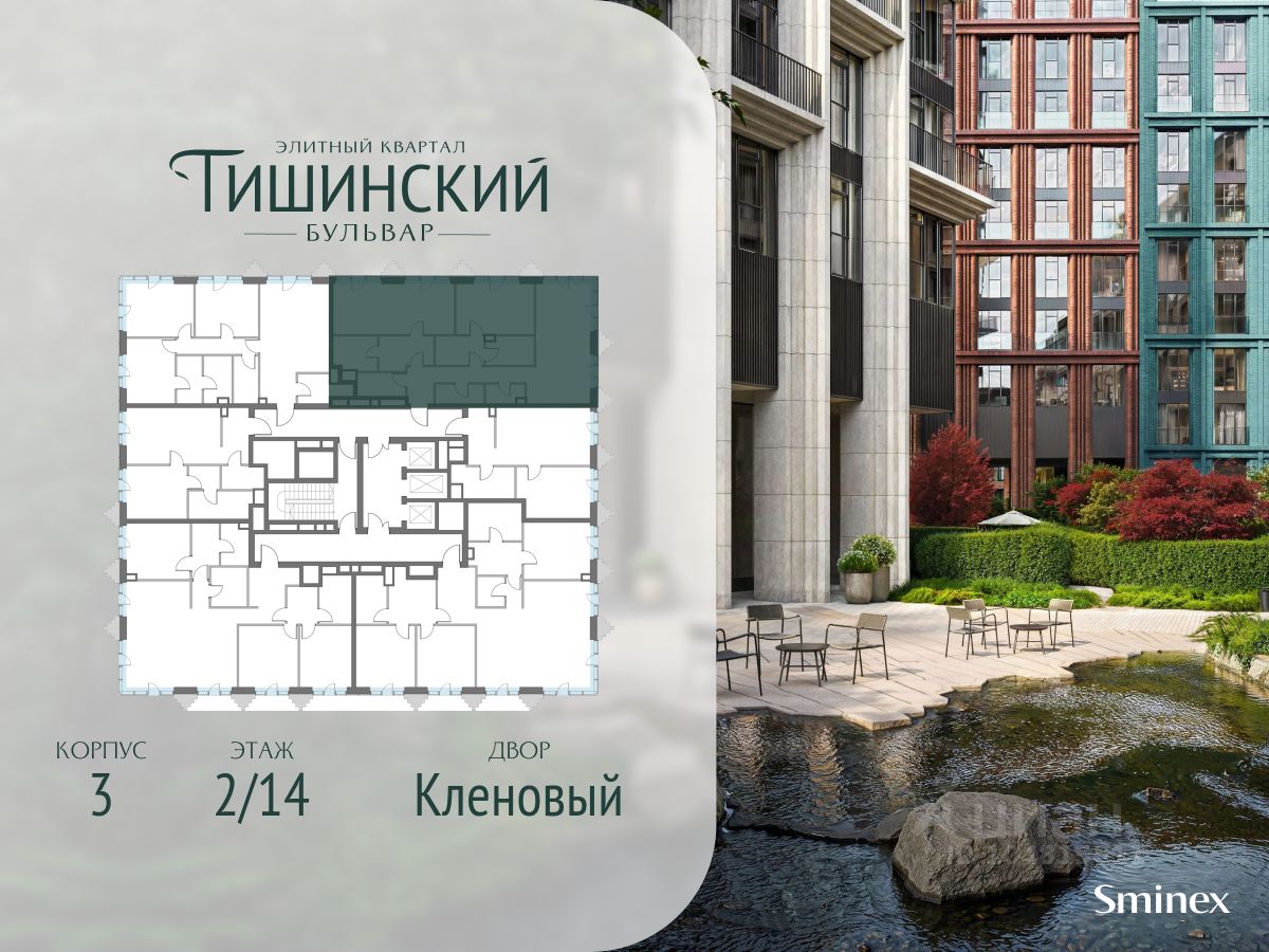 "Тишинский бульвар" - тихий зелёный элитный квартал на Тишинке, в престижном и комфортном районе центра Москвы. В нём создан уникальный для элитного дома прогулочный бульвар в своём огромном парке 1,9 га. В парке оборудованы зоны для активного и тихого отдыха, крытые галереи, приватные зелёные комнаты, многофункциональная спортивная площадка, воркаут-зона, детская площадка, сухой фонтан, ручей.