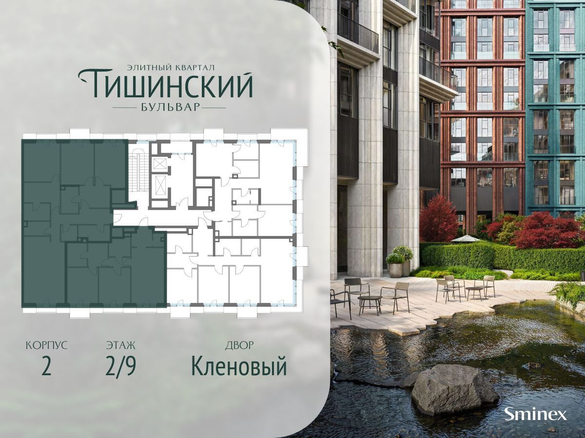 "Тишинский бульвар" - тихий зелёный элитный квартал на Тишинке, в престижном и комфортном районе центра Москвы. В нём создан уникальный для элитного дома прогулочный бульвар в своём огромном парке 1,9 га. В парке оборудованы зоны для активного и тихого отдыха, крытые галереи, приватные зелёные комнаты, многофункциональная спортивная площадка, воркаут-зона, детская площадка, сухой фонтан, ручей.