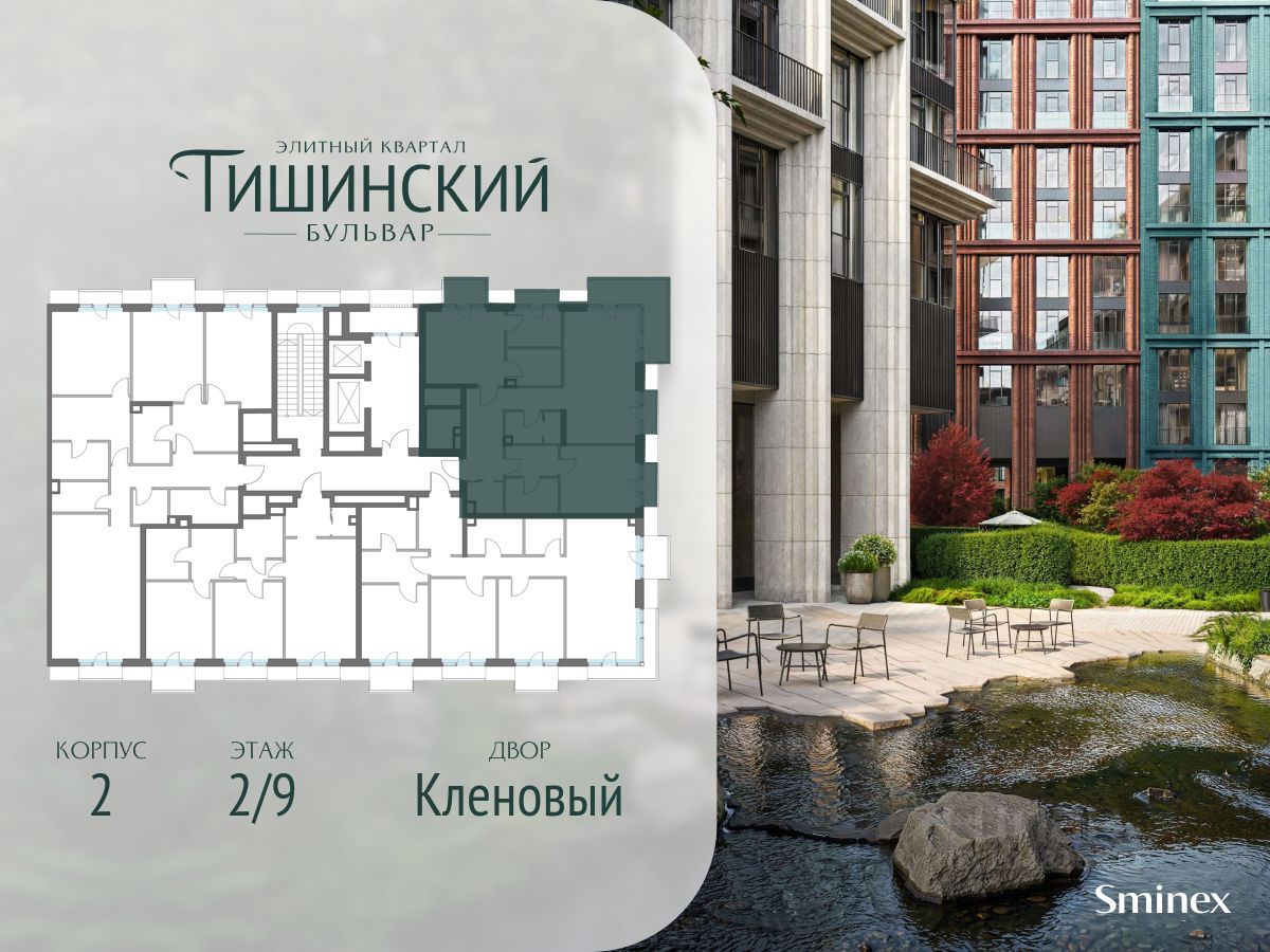 "Тишинский бульвар" - тихий зелёный элитный квартал на Тишинке, в престижном и комфортном районе центра Москвы. В нём создан уникальный для элитного дома прогулочный бульвар в своём огромном парке 1,9 га. В парке оборудованы зоны для активного и тихого отдыха, крытые галереи, приватные зелёные комнаты, многофункциональная спортивная площадка, воркаут-зона, детская площадка, сухой фонтан, ручей.
