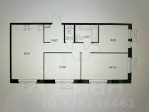 - общая площадь - 69 кв.м., жилая 34,4 кв.м., кухня - 19,7 кв.м., комнаты - 14, 10,8 и 9,6 кв.м.;