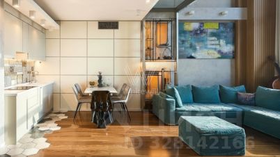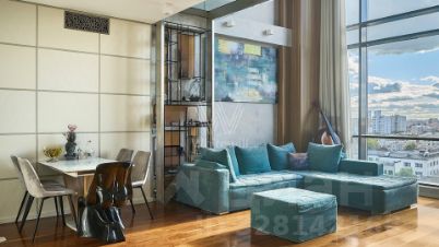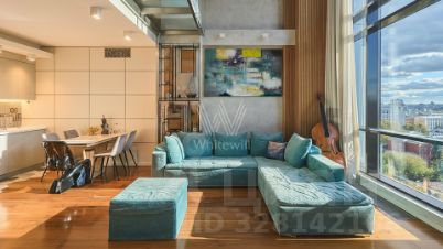 Двухуровневые апартаменты с одной спальней общей площадью 91 м² в комплексе Tribeca Apartments на седьмом этаже. Выполнена дизайнерская отделка с использованием премиальных материалов — массив и эбеновое дерево на полу, керамическая плитка с подогревом в санузлах, стены с микробетоном. Установлена встроенная техника Bosch и Ariston, кондиционеры Daikin и Mitsubishi, приточно-вытяжная система вентиляции. Сантехника представлена брендом Villeroy&Boch, смесители Grohe.