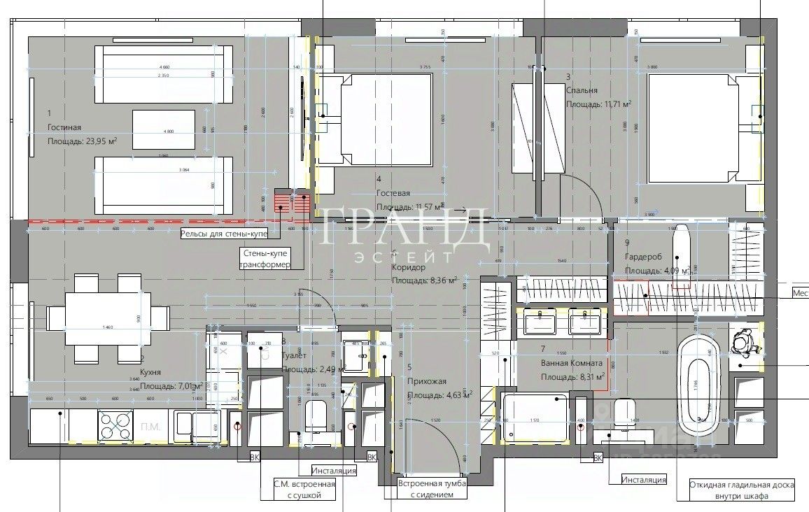 Планировка: 2 спальни, кухня-гостиная (разделяется при необходимости стеной-купе), 2 санузла, гардеробная.