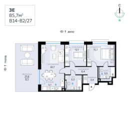 В продаже — двухкомнатная квартира, общей площадью 85,7 кв. м. Квартира расположена на восьмом этаже девятиэтажного корпуса Балансд в квартале В14 нового района СберСити, который строит Сбер.