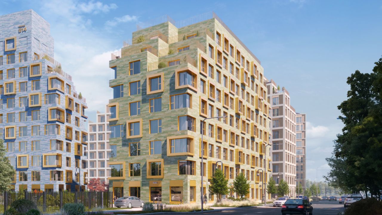 Архитектуру корпусов кварталов разработало итальянское бюро. В облике отражена природная палитра: для фасадов выбраны небесно-голубой и травянистый зелёный оттенки. Декоративные металлические рамы окон и эркеры служат выразительными акцентами. Из окон открываются виды на парк и закаты над рекой. Всего в трёх минутах пешком — набережная, а рядом — главный парк СберСити. Во дворах без машин — много зелени, деревьев, кустарников и многолетних растений, детские площадки и тихие зоны отдыха.