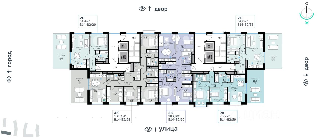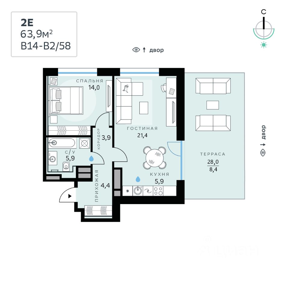 В продаже — однокомнатная квартира, общей площадью 63,9 кв. м. Квартира расположена на девятом этаже девятиэтажного корпуса Балансд в квартале В14 нового района СберСити, который строит Сбер.