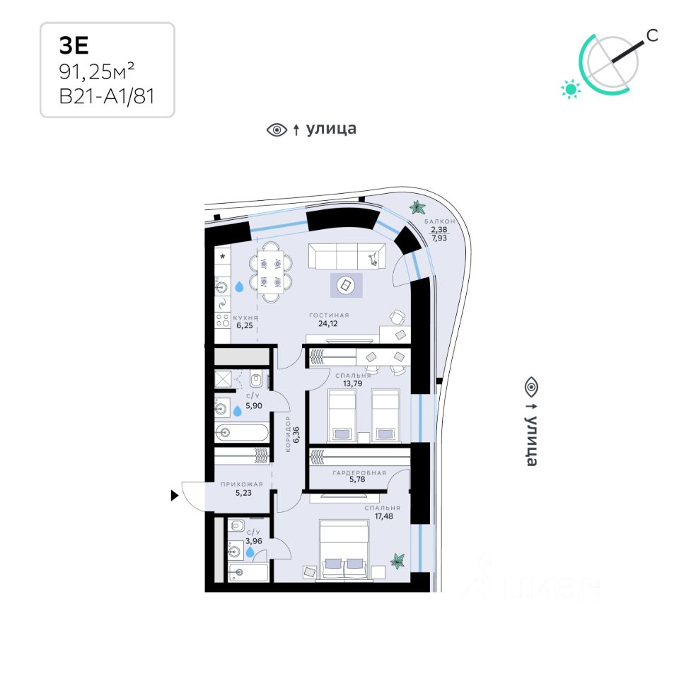 В продаже — двухкомнатная квартира с чистовой отделкой, общей площадью 91,25 кв. м. Квартира расположена на шестом этаже тринадцатиэтажной секции корпуса класса Адвансд в новом районе СберСити, который строит Сбер. Дом находится на второй береговой линии Москвы-реки.