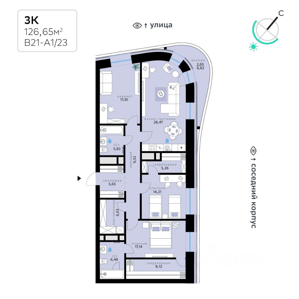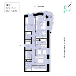 В продаже — трехкомнатная квартира с чистовой отделкой, общей площадью 126,65 кв. м. Квартира расположена на шестом этаже одинадцатиэтажной секции корпуса класса Адвансд в новом районе СберСити, который строит Сбер. Дом находится на второй береговой линии Москвы-реки.