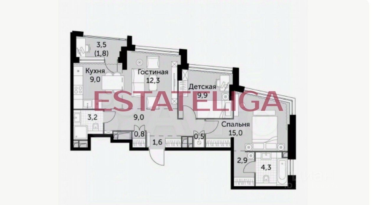 Планировочное решение: три изолированные комнаты, включая мастер-спальню и просторная кухня-гостиная. Два совмещенных санузла, один из которых оборудован окном (в мастер-спальне), также есть лоджия.