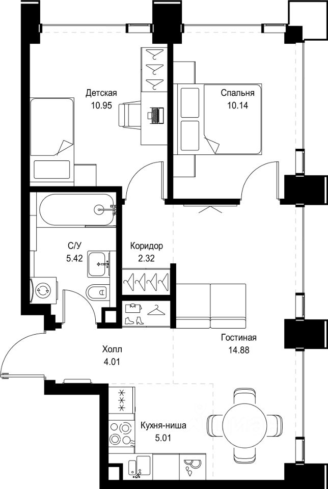 В ЖК Сет продается 2-комнатная квартира площадью 52.73 м², расположенная в корпусе А, на 52 этаже 52 этажного дома.