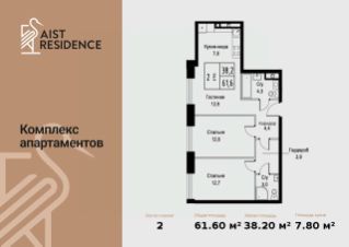 Продаются 3-к апартаменты площадью 61.60 кв.м. на 2-м этаже 30 этажного дома в "AIST RESIDENCE" от ГК МонАрх.