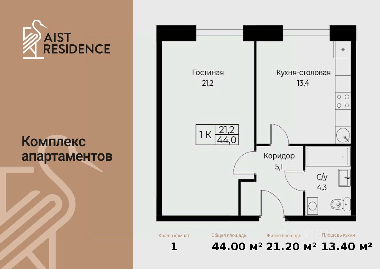 Продаются 1-к апартаменты площадью 44.00 кв.м. на 2-м этаже 30 этажного дома в "AIST RESIDENCE" от ГК МонАрх.