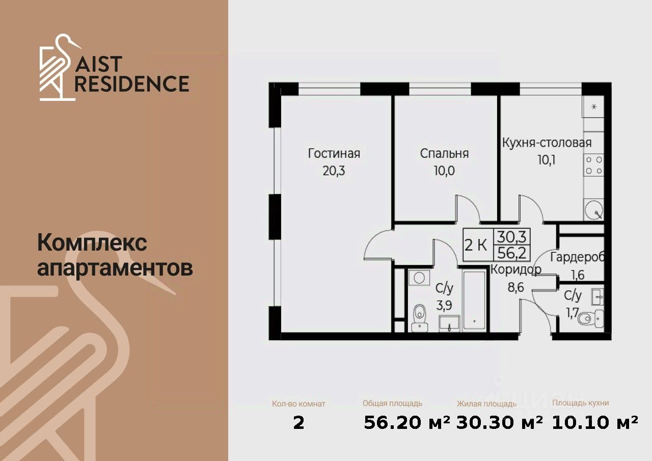 Продаются 2-к апартаменты площадью 56.20 кв.м. на 8-м этаже 30 этажного дома в "AIST RESIDENCE" от ГК МонАрх.