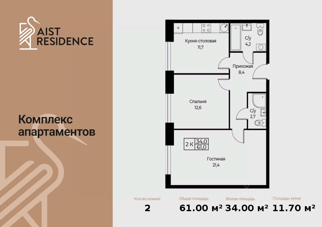 Продаются 2-к апартаменты площадью 61.00 кв.м. на 15-м этаже 30 этажного дома в "AIST RESIDENCE" от ГК МонАрх.