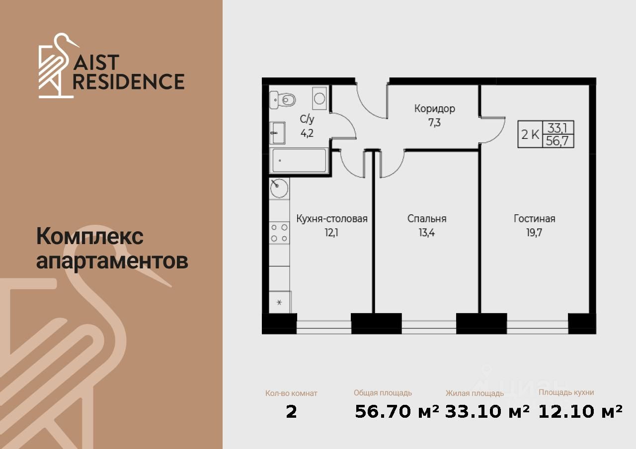Продаются 2-к апартаменты площадью 56.70 кв.м. на 29-м этаже 30 этажного дома в "AIST RESIDENCE" от ГК МонАрх.
