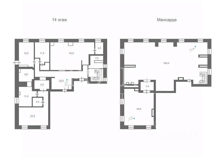 Пентхаус занимает 14-й и 15-й этажи, располагается в "башне" и имеет свой вход, приватную террасу, действующий дровяной камин и панорамные виды на четыре стороны света.