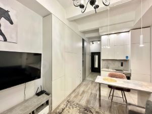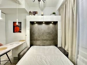 Высокие потолки 3,5 метра, продуманная до мелочей функциональная планировка: кровать трансформер, встроенная кухня, полностью укомплектованная бытовой техникой, большой шкаф и еще много дополнительного места для хранения.