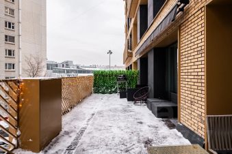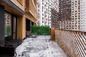 Изюминкой является просторная терраса (30 кв.м.), на которой так приятно наслаждаться утренним кофе или неспешной вечерней беседой. На полу итальянская плитка Atlas Concorde, сама терраса обставлена уютной плетеной и мягкой мебелью, декорирована зеленой изгородью с красивой иллюминацией, есть выдвижная крыша маркиза и возможность поставить современный электрогриль.