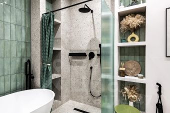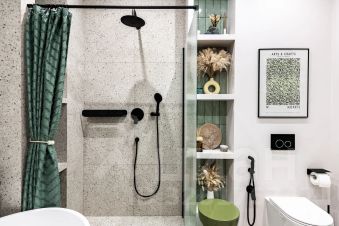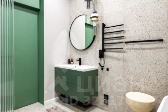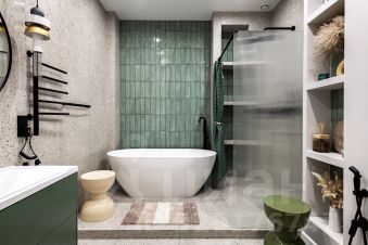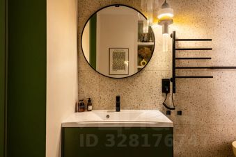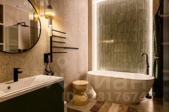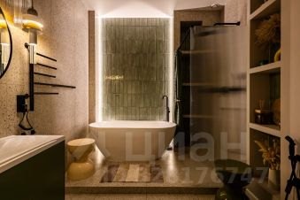 В санузле очень удобная ванная из натурального камня, теплые полы и стена. Во всей квартире дизайнерский свет с различными вариантами освещения, и канальное кондиционирование воздуха.